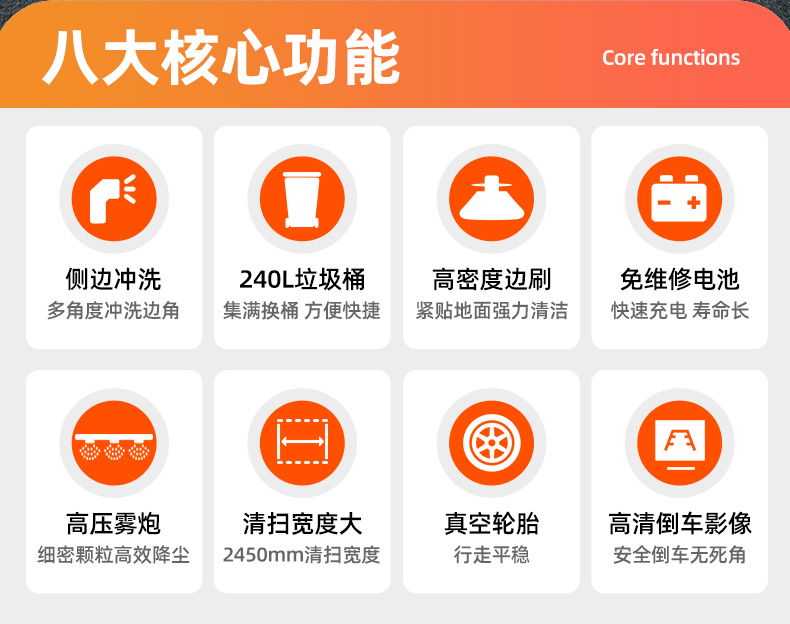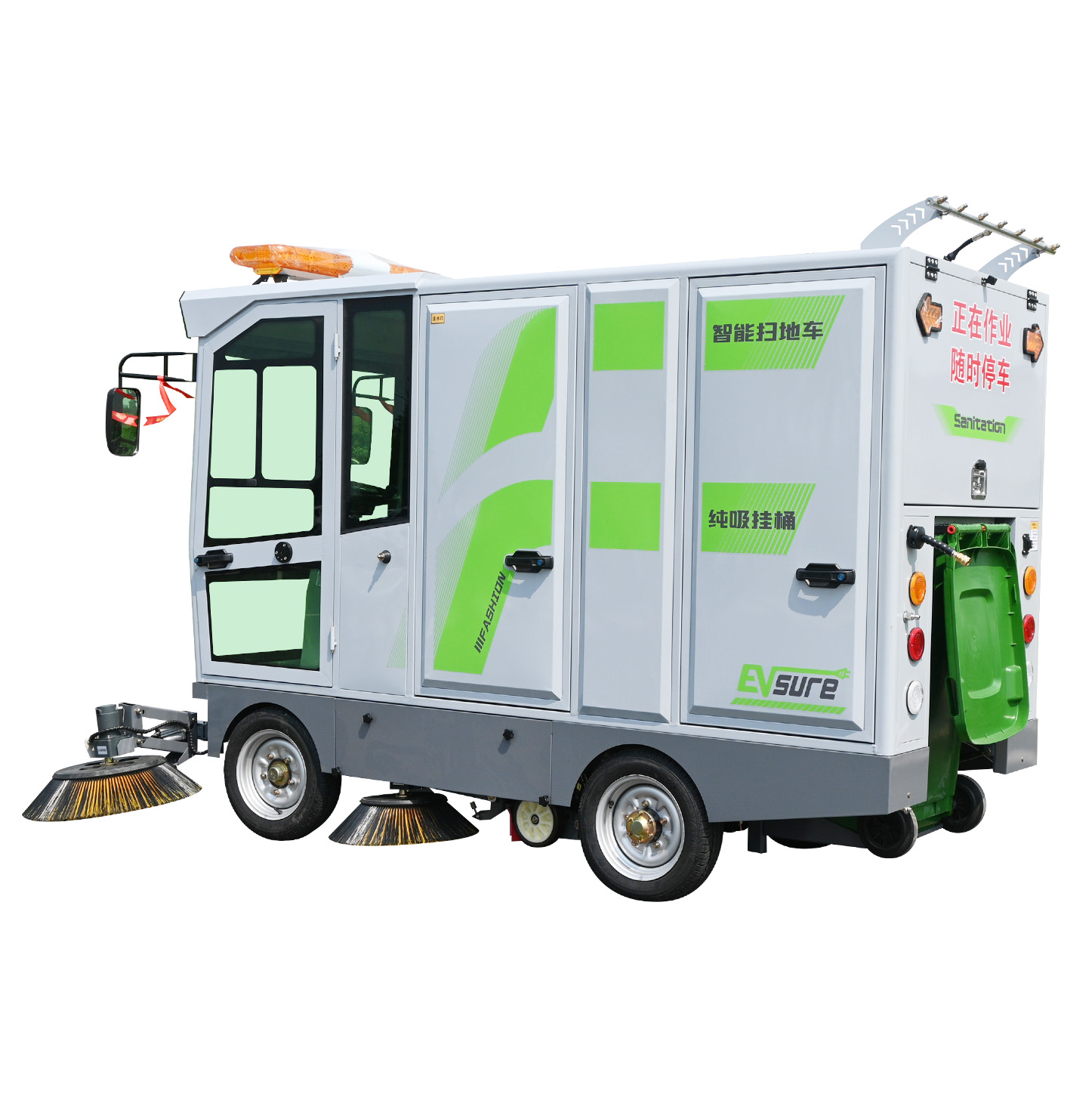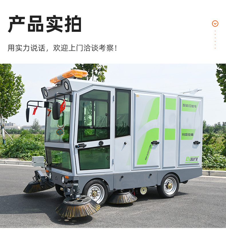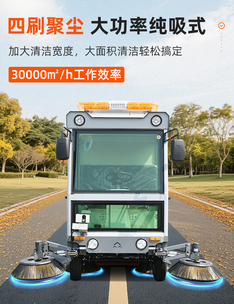 莱特LT-G86型全封闭四轮驾驶式扫地车,此车辆为纯吸款高性能车辆、无滚刷结构,使用效果更稳定。车辆具备智能语音系统,配备高压清洗和高压雾炮功能,清扫宽度2450mm,满电工作时间为3-5小时,工作效率30000㎡/h,采用的是特种车专用磷酸铁锂电池,配置长度4米可拆卸手持吸管,吸净率高,作业速度快。后置240L标准垃圾桶,收集满灰尘垃圾之后,可以直接更换垃圾桶,效率高,无需人工倾倒垃圾。高压雾炮射程可达10米以上,可对作业环境高效的降尘,还可以用于绿植养护和环境消杀。高压水枪可以对地面顽固污渍进行清洁,还可以冲洗路牙石,为绿植浇水,工作之余,还可以用高压水枪清洗车辆。应用场景为:厂区、车间、公园、街道、物业小区、码头、学校、机场等需要大面积清扫的区域区域。