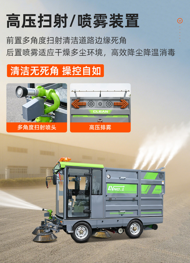 莱特LT-G90型全封闭四轮驾驶式扫地车,此车辆为纯吸款高性能车辆、无滚刷结构,使用效果更稳定。车辆具备智能语音系统,配备高压清洗和高压雾炮功能,清扫宽度2450mm,满电工作时间为3-5小时,工作效率35000㎡/h,采用的是特种车专用磷酸铁锂电池,配置长度4米可拆卸手持吸管,吸净率高,作业速度快。后置双240L标准垃圾桶,收集满灰尘垃圾之后,可以直接更换垃圾桶,效率高,无需人工倾倒垃圾。高压雾炮射程可达10米以上,可对作业环境高效的降尘,还可以用于绿植养护和环境消杀。高压水枪可以对地面顽固污渍进行清洁,还可以冲洗路牙石,为绿植浇水,工作之余,还可以用高压水枪清洗车辆。应用场景为:厂区、车间、公园、街道、物业小区、码头、学校、机场等需要大面积清扫的区域区域。